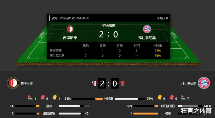 拜仁上半时狂射了14脚无力破门,费耶诺德这边极其高效,总共3脚射门进了2球,这两球说是拜仁送的也不为过,这剧情和昨天拜仁客场对阵本菲卡很像,什琴斯尼上半时送了2个,巴萨半场1:3也是落后2球。巴萨下半时的剧情是逆转绝杀,什琴斯尼将功补过,拜仁今天是要学习巴萨?那下半时就看金玟哉和格雷罗能否将功补过了!